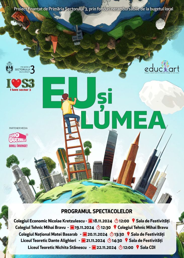 Asociația Centrul Cultural European pentru Educație prin Artă și Cultură EDUC- ART a lansat, la începutul acestui an școlar, un proiect cultural inovator, adresat adolescenților bucureșteni din sectorul 3, pasionați de artele spectacolului și dezvoltare personală. Intitulat “EU și Lumea“, proiectul se desfășoară în perioada septembrie – noiembrie 2024, fiind finanțat de Primăria Sectorului 3 cu fonduri nerambursabile de la bugetul local. Pentru mai multe informații despre programul de finanțare al Primăriei Sectorului 3, vizitați www.primarie3.ro.